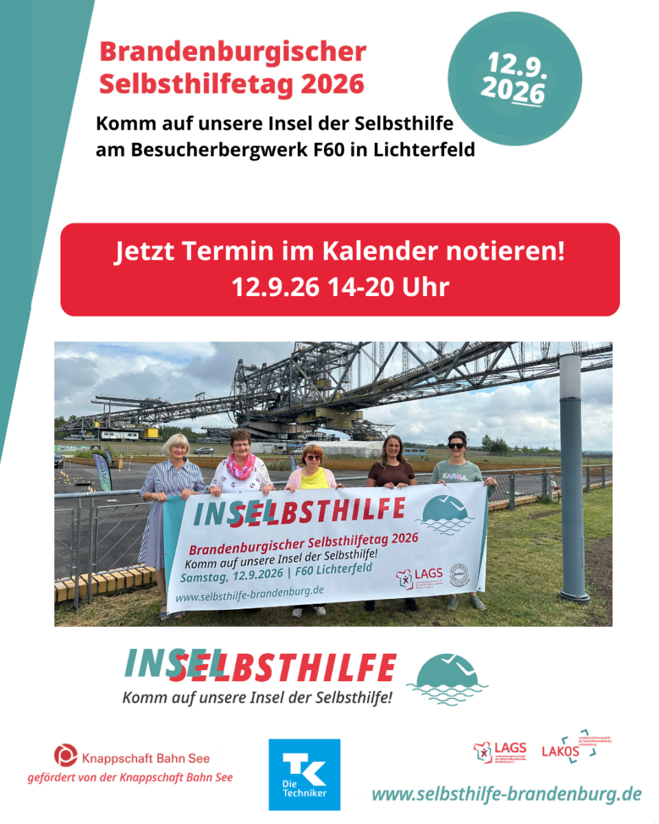 Unter dem Motto „Komm auf unsere Insel der Selbsthilfe“ findet am 12. September 2026 von 14 bis 20 Uhr der 21. Brandenburgische Selbsthilfetag (BSHT) auf dem Gelände der F60 in Lichterfeld statt.
