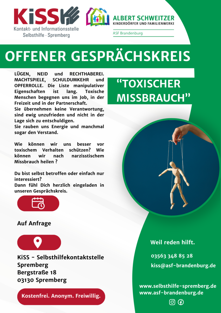 KiSS - Kontakt- und Informationsstelle Selbsthilfe in Spremberg. Wir helfen neue Perspektiven zu finden, soziale Kontakte zu knüpfen und Isolationen zu überwinden. KiSS